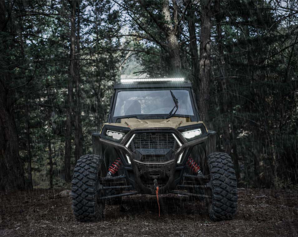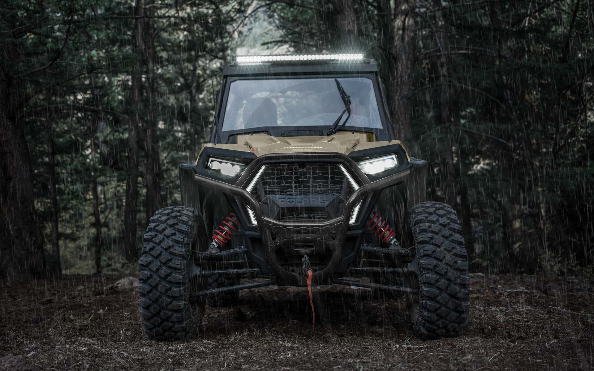 - Iluminação decorativa exclusiva RZR Fang, faróis LED brancos assinados (baixa/alta) e lanternas/travões traseiros em LED vermelho.