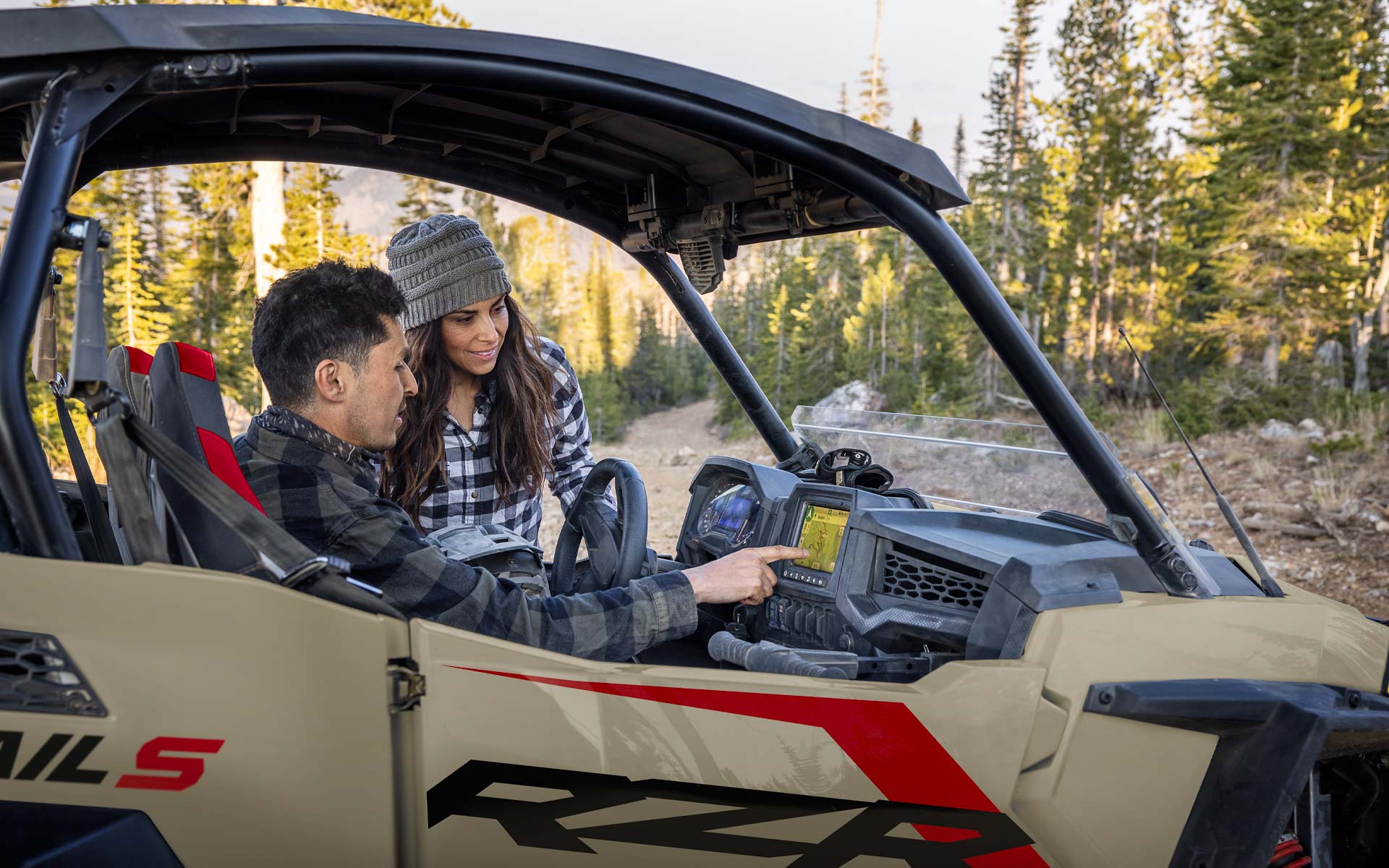 Aproveite ao máximo seu tempo ao ar livre. O RZR Trail utiliza tecnologia avançada para elevar sua experiência de pilotagem, com uma tela líder na categoria de 7" equipada com o RIDE COMMAND e áudio premium instalado de fábrica.